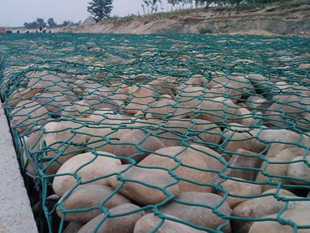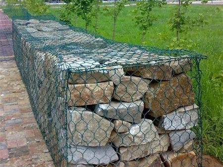 石笼网护垫分表面金属镀层和表面 PVC/PE涂层两个大类。使用的金属线径是根据六角形的大小而不同。生产过程是经织网,剪切,锁边,绑扎后制成石笼和护垫。石笼和护垫以折叠状态供货。
